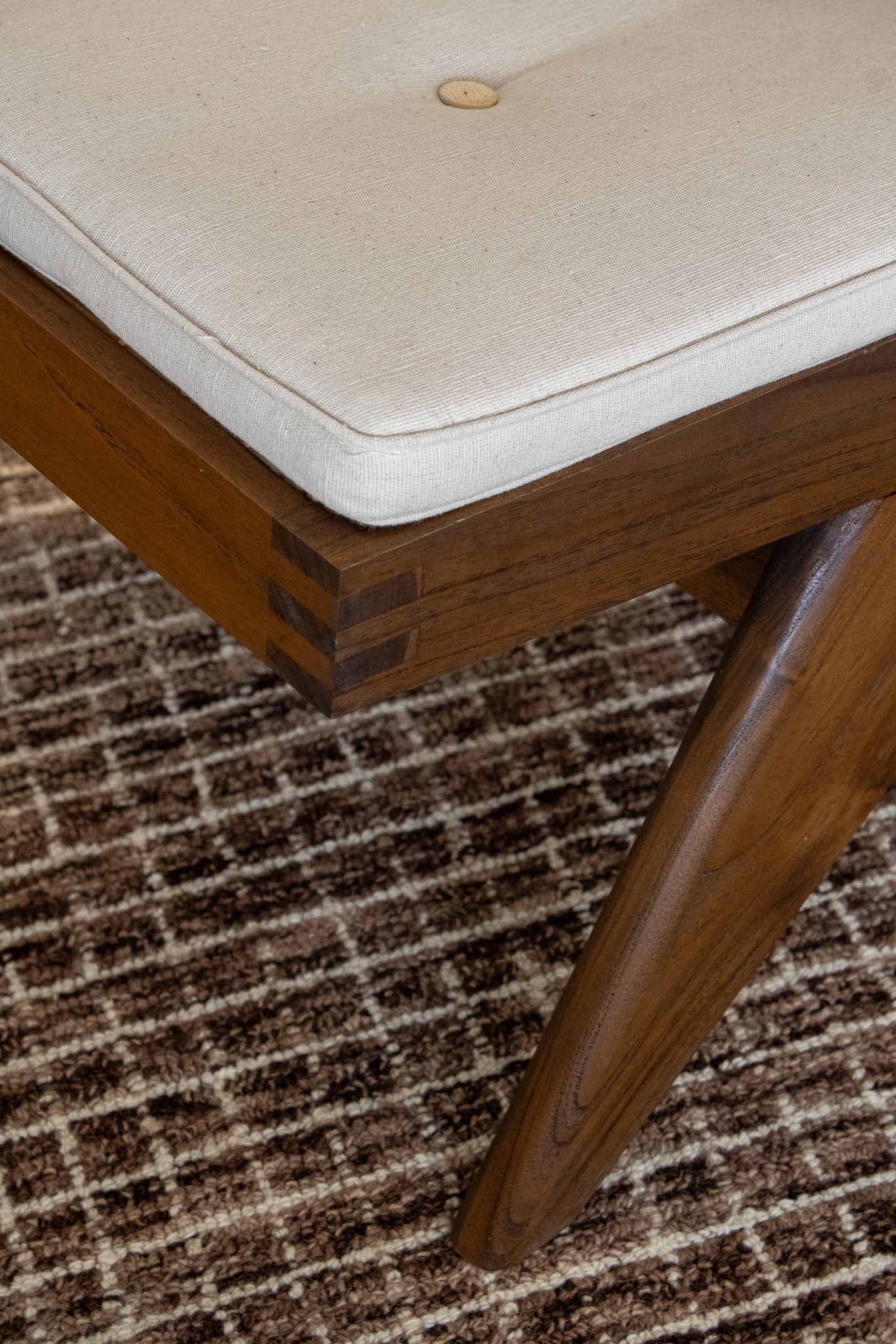 We hand weave the seat and back using the distinctive square webbing pattern. The rattan is woven directly through holes drilled into each teak frame, completing an elegant armless lounge chair.