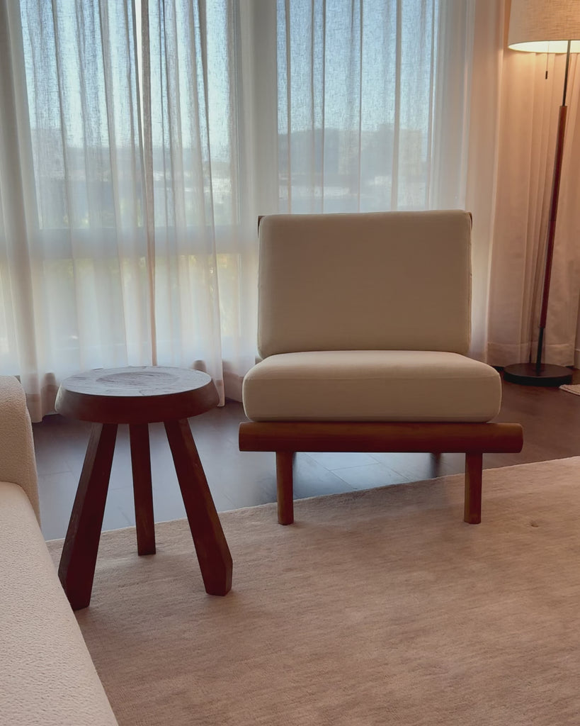 Originally conceived for Arc 1600's La Cachette resort, this iconic chauffeuse chair represents Charlotte Perriand's revolutionary 1960s approach to mountain modernism. The distinctive cylindrical teak frame and modular cushioning maintain the original's elegant simplicity, while incorporating weather-resistant materials for modern versatility.