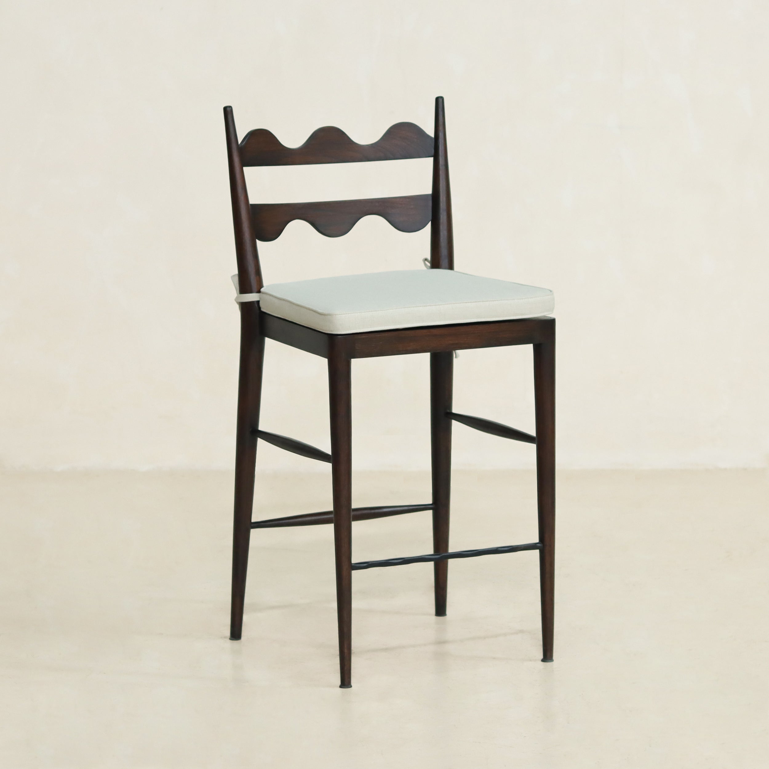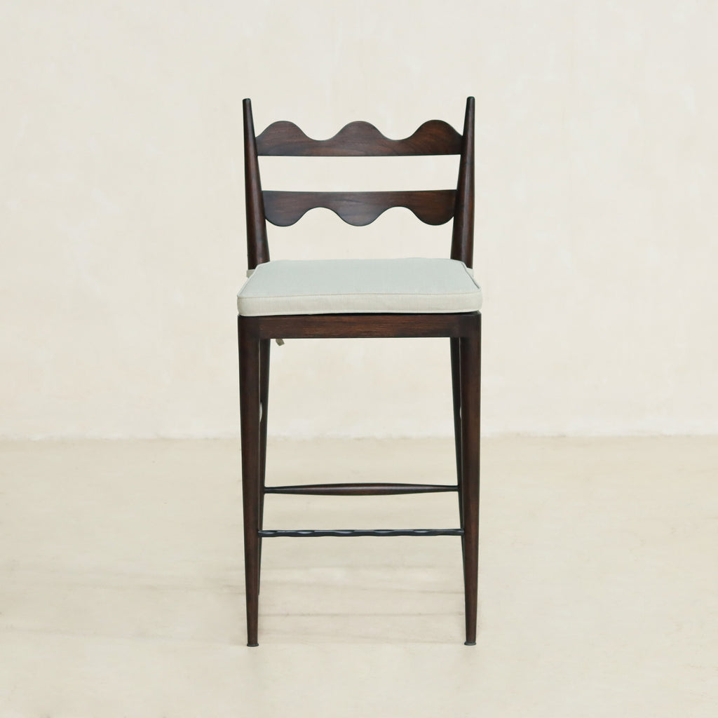 Inspired by Jean Royère’s Ondulation Chair, the Wave Counter Stool’s undulating ladder-back and tapered legs create a striking silhouette, blending seamlessly with the clean lines of french modern furniture to enhance any kitchen island.